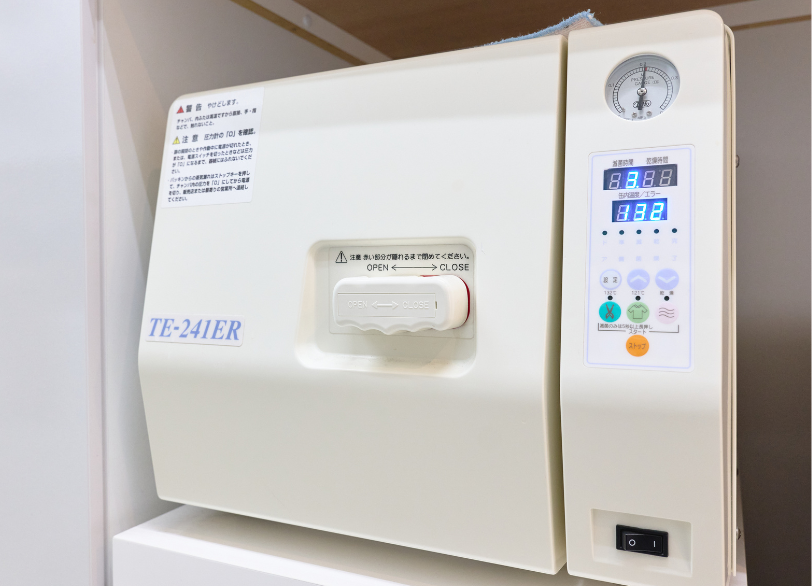 患者様とスタッフの安全を第一に考え、世界基準の滅菌器を導入しています。治療器具は患者様ごとに交換・滅菌し、使い捨て製品も積極的に活用。さらに、院内すべての水をオゾン水にすることで、殺菌効果のある水で治療を行います。安心して通院いただける清潔な環境づくりに努めています。